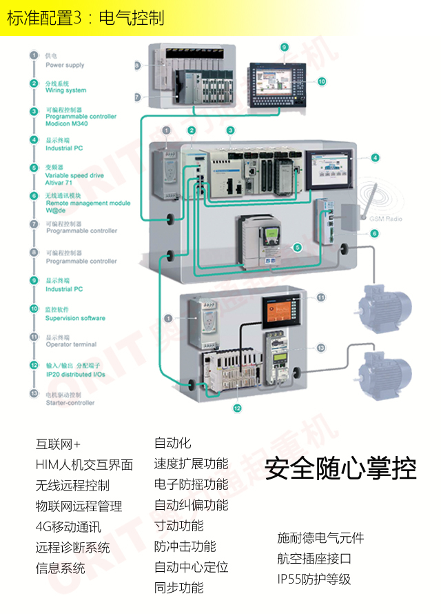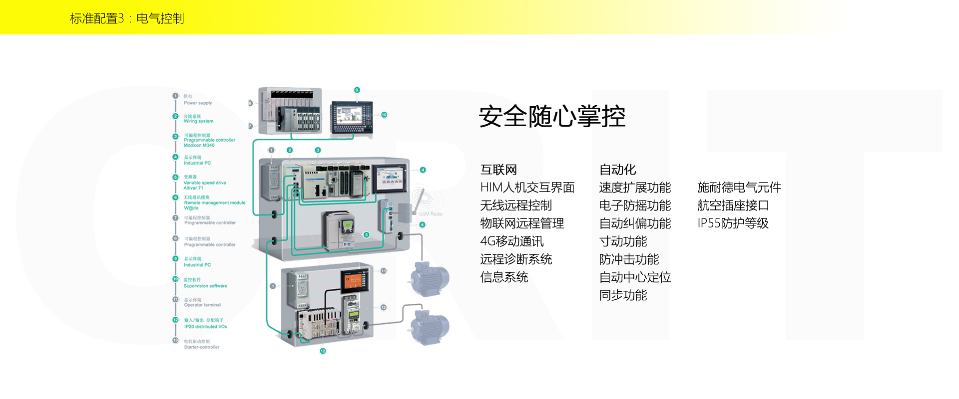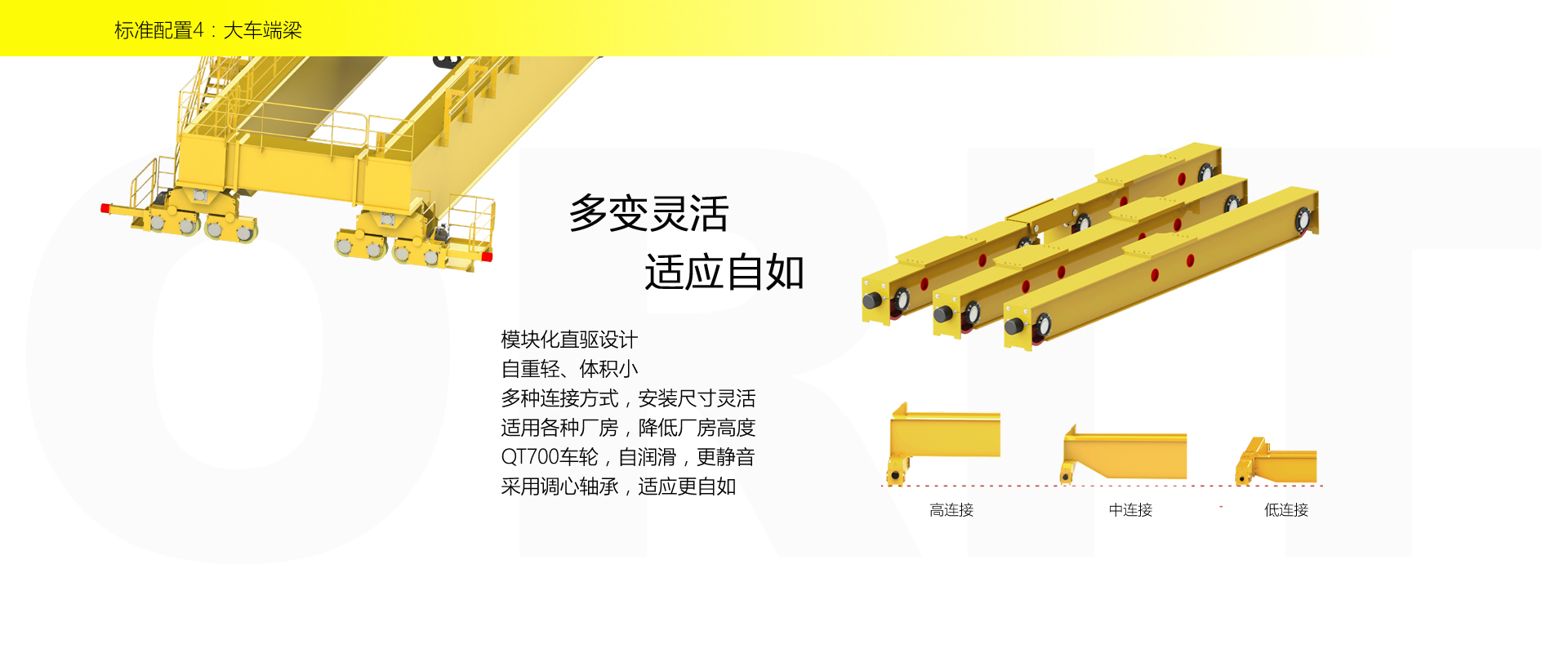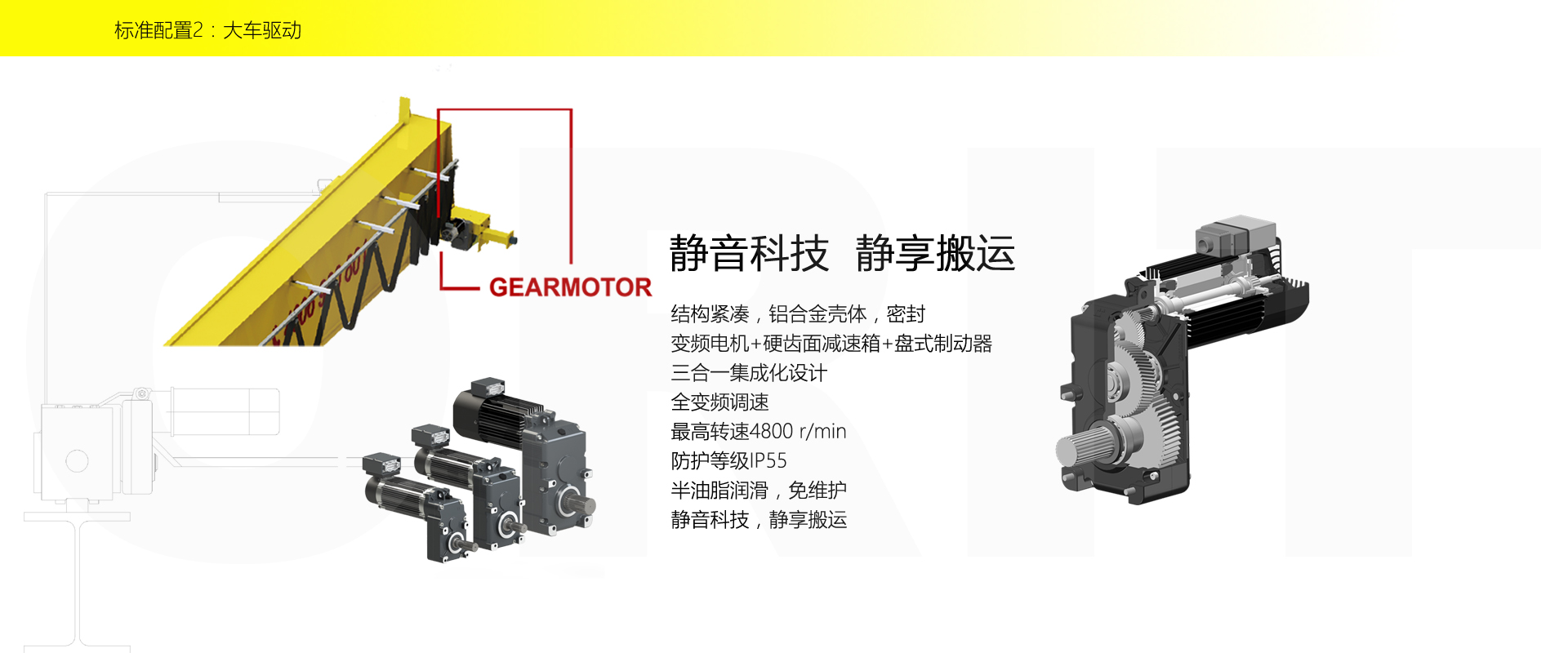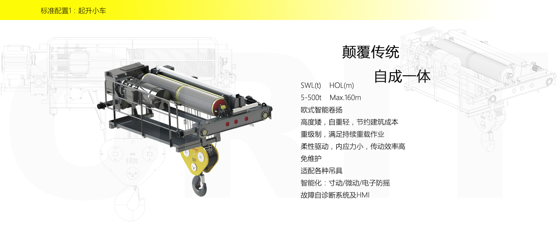 產(chǎn)品名稱:大噸位起重機(jī) 優(yōu)化設(shè)計(jì),自重輕,輪壓小,高度矮 硬齒面柔性驅(qū)動(dòng),緊湊型結(jié)構(gòu) 變頻控制,運(yùn)行平穩(wěn) 實(shí)時(shí)安全監(jiān)控,確保吊運(yùn)安全 標(biāo)準(zhǔn)化配置,讓性能無比穩(wěn)定 適用于500t以下雙梁起重機(jī) 標(biāo)準(zhǔn)配置1:起升機(jī)構(gòu) 顛覆傳統(tǒng),自成一體 SWL(t) HOL(m) 5-500t Max.160m 歐式智能卷?yè)P(yáng) 高度矮,自重輕,節(jié)約建筑成本 重級(jí)制,滿足持續(xù)重載作業(yè) 柔性驅(qū)動(dòng),內(nèi)應(yīng)力小,傳動(dòng)效率高 免維護(hù) 適配各種吊具 智能化:寸動(dòng)/微動(dòng)/電子防搖 故障自診斷系統(tǒng)及HMI 標(biāo)準(zhǔn)配置2:三合一驅(qū)動(dòng) 靜音科技,靜享搬運(yùn) 結(jié)構(gòu)緊湊,鋁合金殼體,密封 變頻電機(jī)+硬齒面減速箱+盤式制動(dòng)器 龍門專用C型三合一集成化設(shè)計(jì),節(jié)約空間 全變頻調(diào)速 最高轉(zhuǎn)速4800 r/min 防護(hù)等級(jí)IP55 半油脂潤(rùn)滑,免維護(hù) 靜音科技,靜享搬運(yùn) 標(biāo)準(zhǔn)配置3:電控系統(tǒng) 安全隨心掌控 智能安全監(jiān)控器 計(jì)算起升機(jī)構(gòu)剩余安全工作時(shí)間 累計(jì)起升工作時(shí)間 累計(jì)超載次數(shù) 累計(jì)起升電機(jī)啟動(dòng)次數(shù) 起升電機(jī)過熱保護(hù)及報(bào)警 剎車片厚度報(bào)警 ... ... 遠(yuǎn)程通訊 施耐德電氣元件 航空插座接口 IP55防護(hù)等級(jí) 互聯(lián)網(wǎng)+ HIM人機(jī)交互界面 無線遠(yuǎn)程控制 物聯(lián)網(wǎng)遠(yuǎn)程管理 4G移動(dòng)通訊 遠(yuǎn)程診斷系統(tǒng) 信息系統(tǒng) 自動(dòng)化 速度擴(kuò)展功能 電子防搖功能 自動(dòng)糾偏功能 寸動(dòng)功能 防沖擊功能 自動(dòng)中心定位 同步功能 標(biāo)準(zhǔn)配置4:端梁 多變靈活,適應(yīng)自如 模塊化直驅(qū)設(shè)計(jì) 自重輕、體積小 多種連接方式,安裝尺寸靈活 適用各種廠房,降低廠房高度 QT700車輪,自潤(rùn)滑,更靜音 采用調(diào)心軸承,適應(yīng)更自如 應(yīng)用