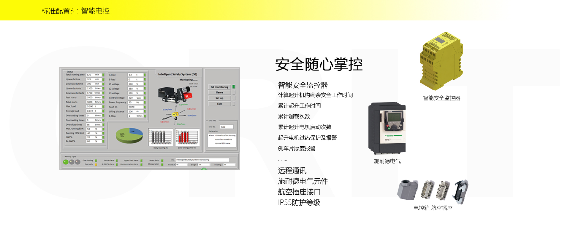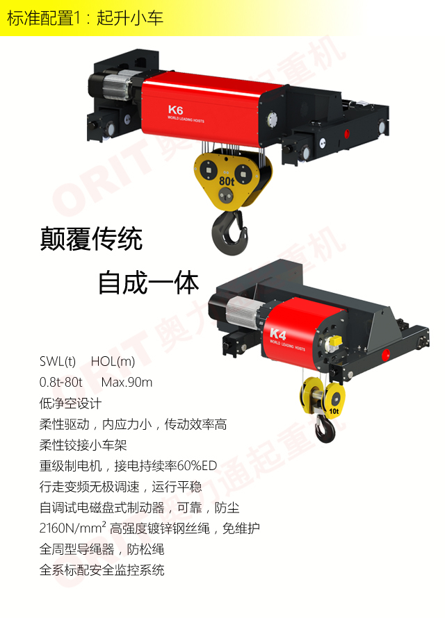 產品名稱:雙梁橋式起重機 小身材、大能力、高智慧 優化設計,自重輕,輪壓小,高度矮 硬齒面柔性驅動,緊湊型結構 變頻控制,運行平穩 實時安全監控,確保吊運安全 標準化配置,讓性能無比穩定 適用于80t以下雙梁起重機 標準配置1:起升機構 顛覆傳統,自成一體 SWL(t) HOL(m) 0.8t-80t Max.90m 低凈空設計 柔性驅動,內應力小,傳動效率高 柔性鉸接小車架 重級制電機,接電持續率60%ED 行走變頻無極調速,運行平穩 自調試電磁盤式制動器,可靠,防塵 2160N/mm2 高強度鍍鋅鋼絲繩,免維護 全周型導繩器,防松繩 全系標配安全監控系統 標準配置2:三合一驅動 靜音科技,靜享搬運 結構緊湊,鋁合金殼體,密封 變頻電機+硬齒面減速箱+盤式制動器 三合一集成化設計 全變頻調速 最高轉速4800 r/min 防護等級IP55 半油脂潤滑,免維護 靜音科技,靜享搬運 標準配置3:電控系統 安全隨心掌控 智能安全監控器 計算起升機構剩余安全工作時間 累計起升工作時間 累計超載次數 累計起升電機啟動次數 起升電機過熱保護及報警 剎車片厚度報警 ... ... 遠程通訊 施耐德電氣元件 航空插座接口 IP55防護等級 標準配置4:端梁 多變靈活,適應自如 模塊化直驅設計 自重輕、體積小 多種連接方式,安裝尺寸靈活 適用各種廠房,降低廠房高度 QT700車輪,自潤滑,更靜音 采用調心軸承,適應更自如 應用
