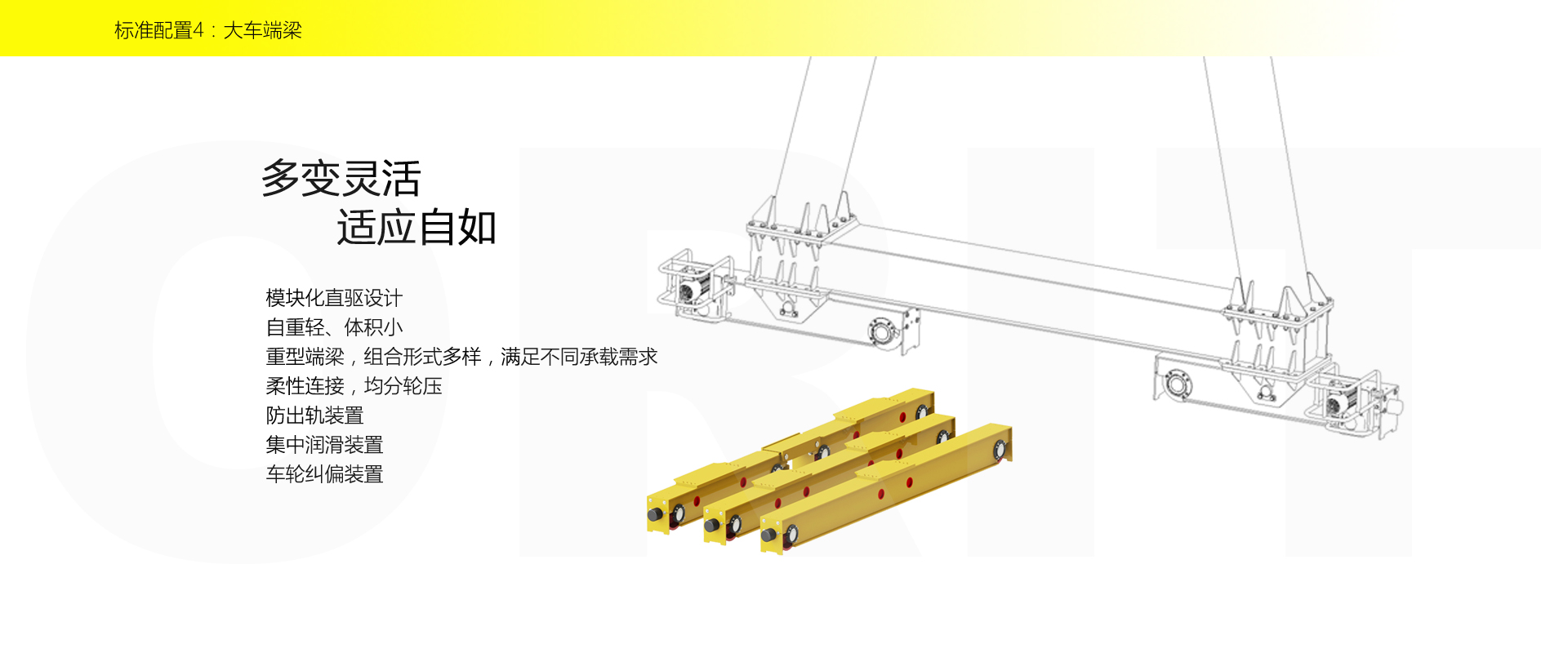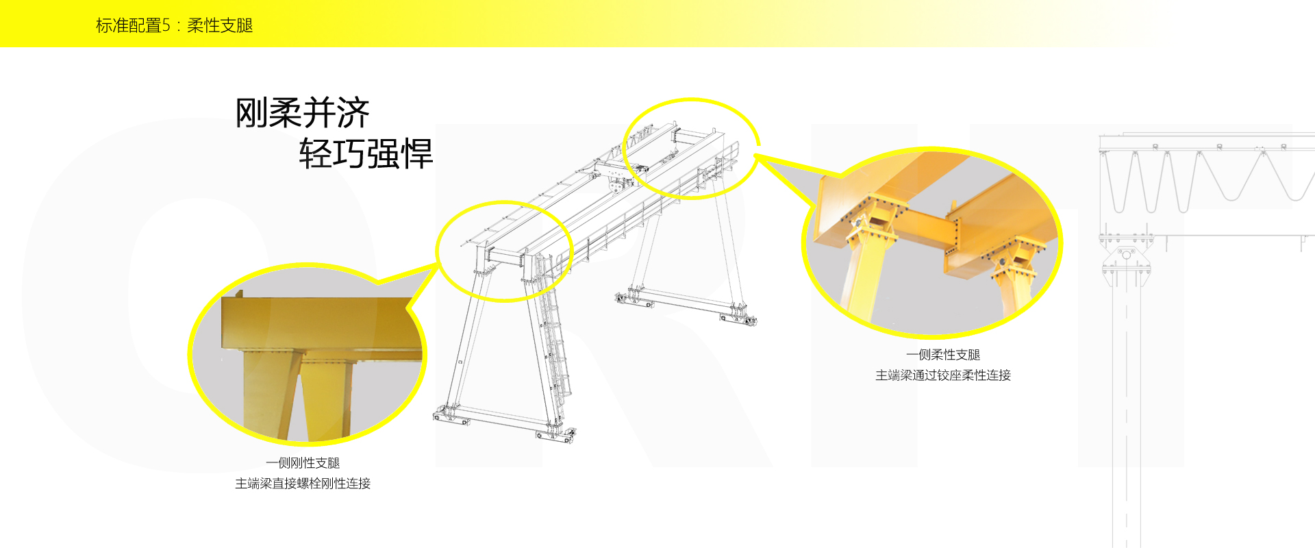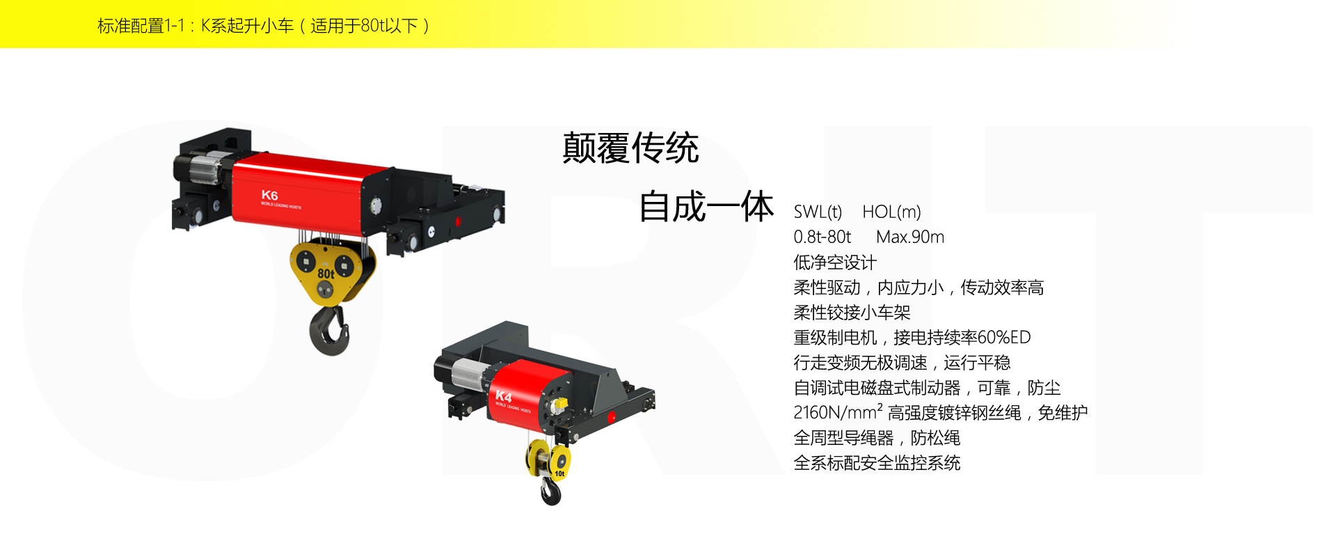產(chǎn)品名稱:雙梁門式起重機(jī) 剛?cè)岵?jì) 小體積 大能耐 優(yōu)化設(shè)計(jì),結(jié)構(gòu)緊湊 柔性支腿,有效釋放應(yīng)力,延遲結(jié)構(gòu)壽命 柔性支腿,體積小,節(jié)省空間 變頻控制,運(yùn)行平穩(wěn) 實(shí)時(shí)安全監(jiān)控,確保吊運(yùn)安全 標(biāo)準(zhǔn)化配置,讓性能無比穩(wěn)定 配置K系起升,適用于80t以下額定載荷 無牛腿車間搬運(yùn)的最佳解決方案 配置CM智能卷揚(yáng)起升,適用于500t以下額定載荷起吊 標(biāo)準(zhǔn)配置1-1:起升機(jī)構(gòu) SWL(t) HOL(m) 0.8t-80t Max.90m 低凈空設(shè)計(jì) 柔性驅(qū)動(dòng),內(nèi)應(yīng)力小,傳動(dòng)效率高 柔性鉸接小車架 重級(jí)制電機(jī),接電持續(xù)率60%ED 行走變頻無極調(diào)速,運(yùn)行平穩(wěn) 自調(diào)試電磁盤式制動(dòng)器,可靠,防塵 2160N/mm2 高強(qiáng)度鍍鋅鋼絲繩,免維護(hù) 全周型導(dǎo)繩器,防松繩 全系標(biāo)配安全監(jiān)控系統(tǒng) 標(biāo)準(zhǔn)配置1-2:起升機(jī)構(gòu) 顛覆傳統(tǒng),自成一體 SWL(t) HOL(m) 5-500t Max.160m 歐式智能卷揚(yáng) 高度矮,自重輕,節(jié)約建筑成本 重級(jí)制,滿足持續(xù)重載作業(yè) 柔性驅(qū)動(dòng),內(nèi)應(yīng)力小,傳動(dòng)效率高 免維護(hù) 適配各種吊具 智能化:寸動(dòng)/微動(dòng)/電子防搖 故障自診斷系統(tǒng)及HMI 標(biāo)準(zhǔn)配置2:三合一驅(qū)動(dòng) 靜音科技,靜享搬運(yùn) 結(jié)構(gòu)緊湊,鋁合金殼體,密封 變頻電機(jī)+硬齒面減速箱+盤式制動(dòng)器 三合一集成化設(shè)計(jì) 全變頻調(diào)速 最高轉(zhuǎn)速4800 r/min 防護(hù)等級(jí)IP55 半油脂潤滑,免維護(hù) 靜音科技,靜享搬運(yùn) 標(biāo)準(zhǔn)配置3:電控系統(tǒng) 安全隨心掌控 互聯(lián)網(wǎng)+ HIM人機(jī)交互界面 無線遠(yuǎn)程控制 物聯(lián)網(wǎng)遠(yuǎn)程管理 4G移動(dòng)通訊 遠(yuǎn)程診斷系統(tǒng) 信息系統(tǒng) 自動(dòng)化 速度擴(kuò)展功能 電子防搖功能 自動(dòng)糾偏功能 寸動(dòng)功能 防沖擊功能 自動(dòng)中心定位 同步功能 智能安全監(jiān)控器 計(jì)算起升機(jī)構(gòu)剩余安全工作時(shí)間 累計(jì)起升工作時(shí)間 累計(jì)超載次數(shù) 累計(jì)起升電機(jī)啟動(dòng)次數(shù) 起升電機(jī)過熱保護(hù)及報(bào)警 剎車片厚度報(bào)警 ... ... 遠(yuǎn)程通訊 施耐德電氣元件 航空插座接口 IP55防護(hù)等級(jí) 標(biāo)準(zhǔn)配置4:端梁 多變靈活,適應(yīng)自如 模塊化直驅(qū)設(shè)計(jì) 自重輕、體積小 重型端梁,組合形式多樣,滿足不同承載需求 柔性連接,均分輪壓 防出軌裝置 集中潤滑裝置 車輪糾偏裝置 柔性支腿 剛?cè)岵?jì),輕巧強(qiáng)悍 一側(cè)剛性支腿,主端梁直接螺栓剛性連接 一側(cè)柔性支腿,主端梁通過鉸座柔性連接