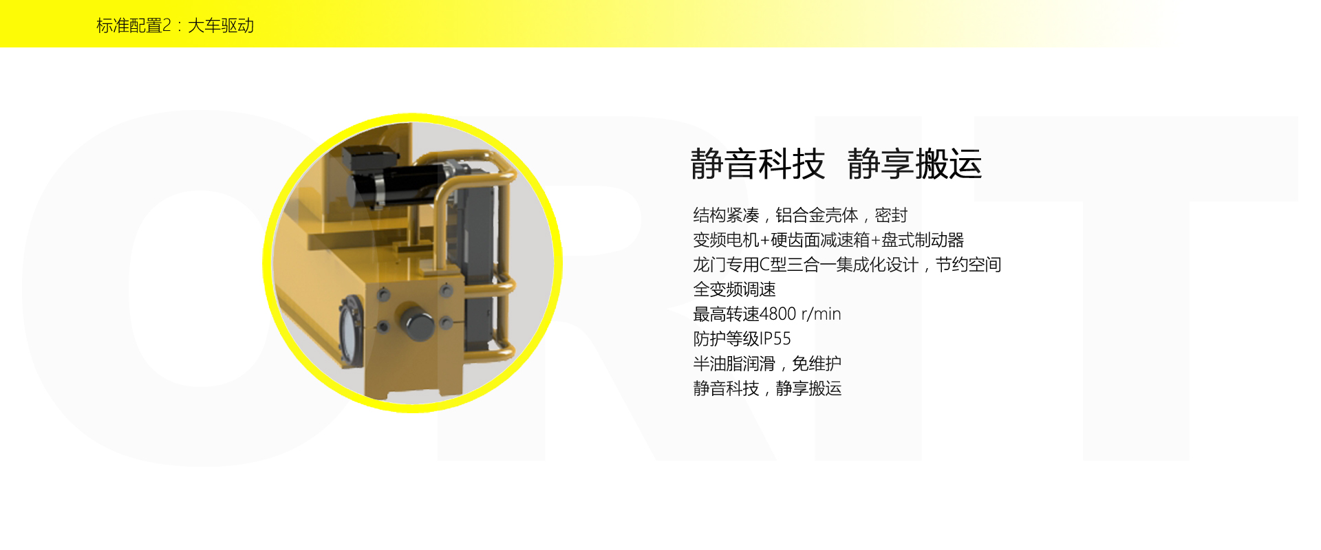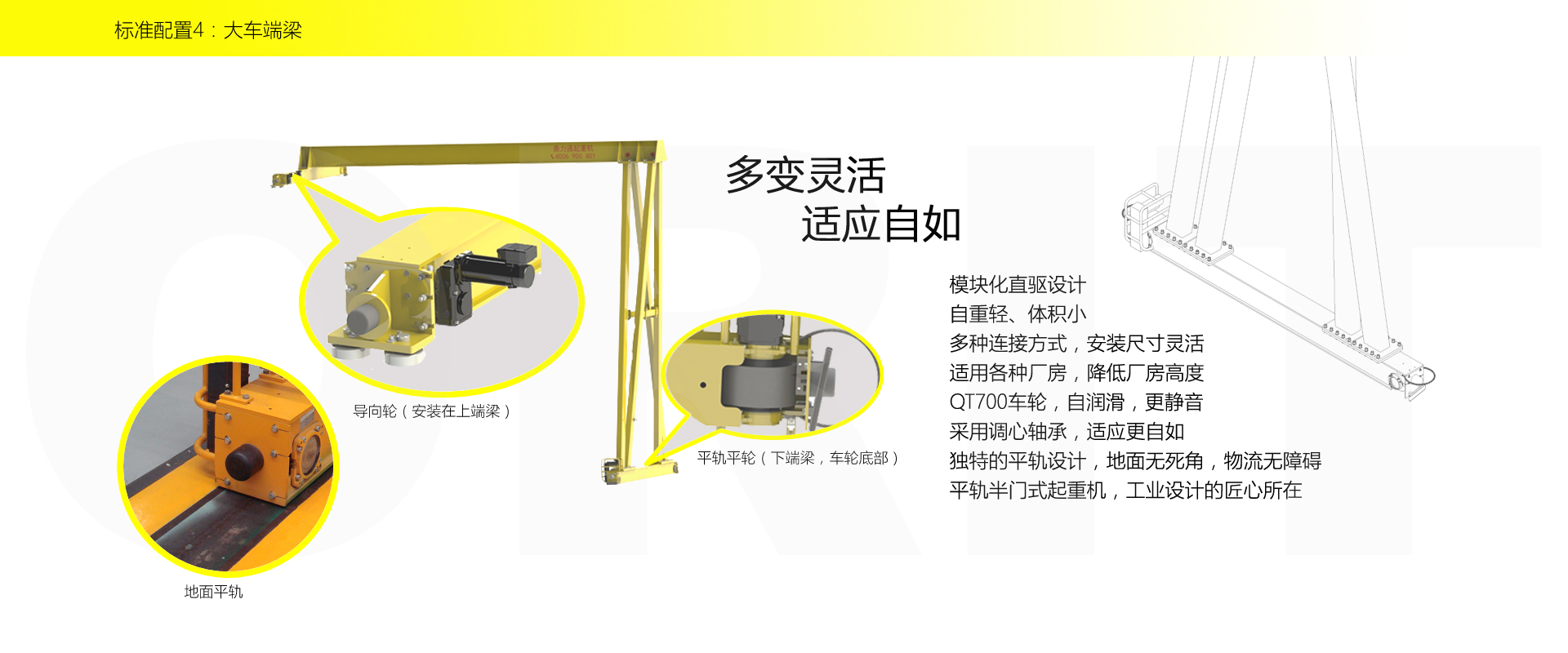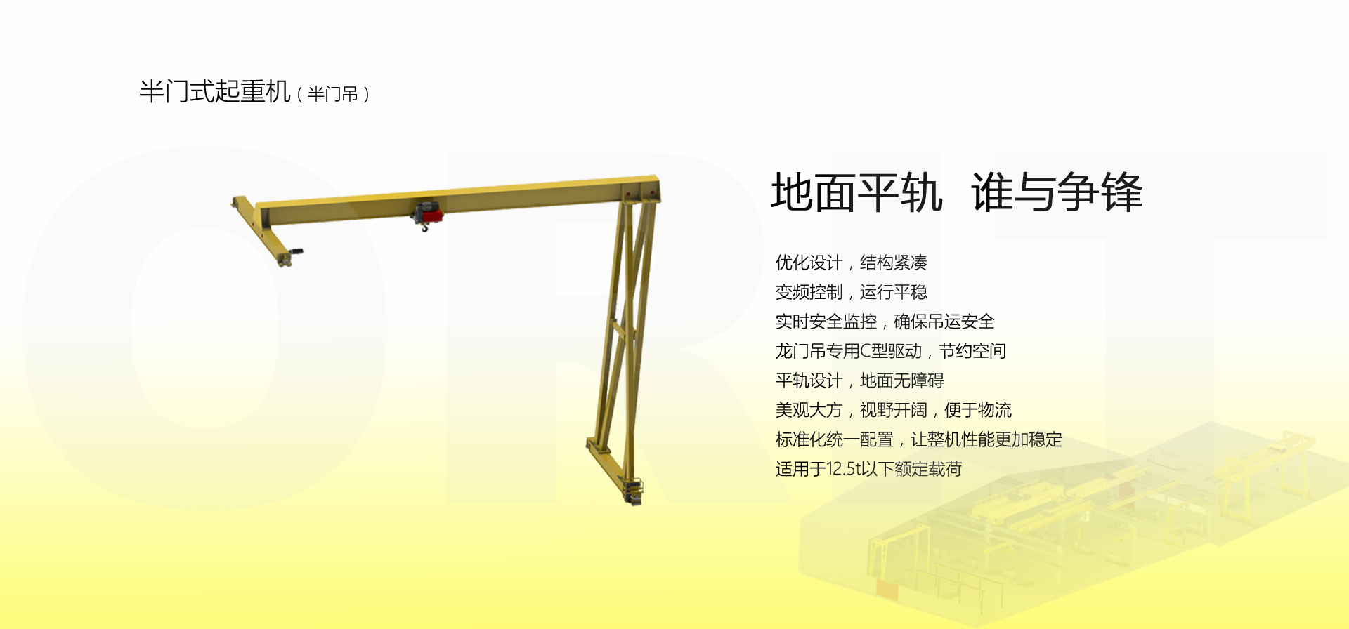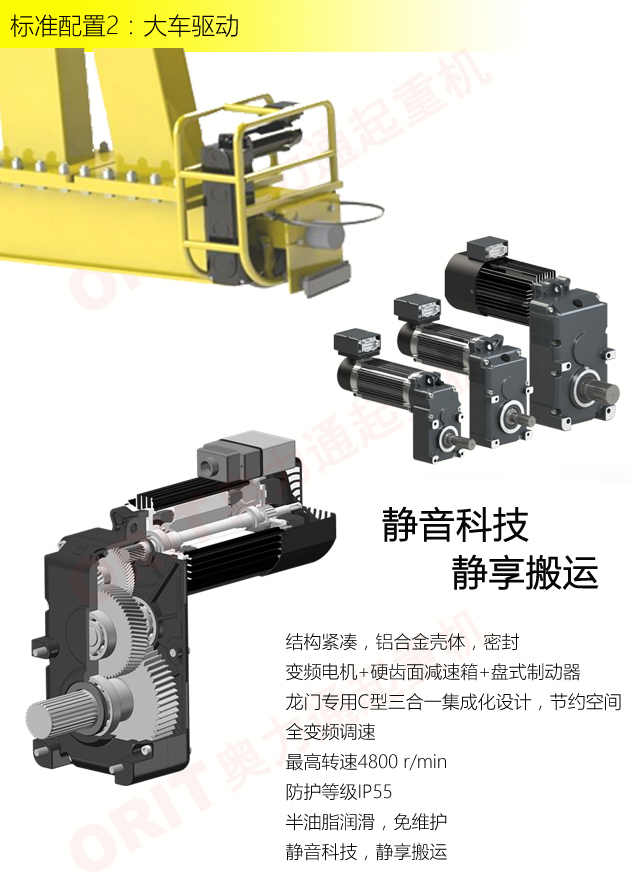 產(chǎn)品名稱(chēng):半門(mén)式起重機(jī) 優(yōu)化設(shè)計(jì),結(jié)構(gòu)緊湊 變頻控制,運(yùn)行平穩(wěn) 實(shí)時(shí)安全監(jiān)控,確保吊運(yùn)安全 龍門(mén)吊專(zhuān)用C型驅(qū)動(dòng),節(jié)約空間 平軌設(shè)計(jì),地面無(wú)障礙 美觀大方,視野開(kāi)闊,便于物流 標(biāo)準(zhǔn)化配置,讓性能無(wú)比穩(wěn)定 適用于12.5t以下額定載荷 標(biāo)準(zhǔn)配置1:起升機(jī)構(gòu) 顛覆傳統(tǒng),自成一體 低凈空設(shè)計(jì) 柔性驅(qū)動(dòng),內(nèi)應(yīng)力小,傳動(dòng)效率高 重級(jí)制電機(jī),接電持續(xù)率60%ED 行走變頻無(wú)極調(diào)速,運(yùn)行平穩(wěn) 自調(diào)試電磁盤(pán)式制動(dòng)器,可靠,防塵 2160N/mm2 高強(qiáng)度鍍鋅鋼絲繩,免維護(hù) 全周型導(dǎo)繩器,防松繩 全系標(biāo)配安全監(jiān)控系統(tǒng) 標(biāo)準(zhǔn)配置2:三合一驅(qū)動(dòng) 靜音科技,靜享搬運(yùn) 結(jié)構(gòu)緊湊,鋁合金殼體,密封 變頻電機(jī)+硬齒面減速箱+盤(pán)式制動(dòng)器 龍門(mén)專(zhuān)用C型三合一集成化設(shè)計(jì),節(jié)約空間 全變頻調(diào)速 最高轉(zhuǎn)速4800 r/min 防護(hù)等級(jí)IP55 半油脂潤(rùn)滑,免維護(hù) 靜音科技,靜享搬運(yùn) 標(biāo)準(zhǔn)配置3:電控系統(tǒng) 安全隨心掌控 智能安全監(jiān)控器 計(jì)算起升機(jī)構(gòu)剩余安全工作時(shí)間 累計(jì)起升工作時(shí)間 累計(jì)超載次數(shù) 累計(jì)起升電機(jī)啟動(dòng)次數(shù) 起升電機(jī)過(guò)熱保護(hù)及報(bào)警 剎車(chē)片厚度報(bào)警 ... ... 遠(yuǎn)程通訊 施耐德電氣元件 航空插座接口 IP55防護(hù)等級(jí) 標(biāo)準(zhǔn)配置4:端梁 多變靈活,適應(yīng)自如 模塊化直驅(qū)設(shè)計(jì) 自重輕、體積小 多種連接方式,安裝尺寸靈活 適用各種廠房,降低廠房高度 QT700車(chē)輪,自潤(rùn)滑,更靜音 采用調(diào)心軸承,適應(yīng)更自如 獨(dú)特的平軌設(shè)計(jì),地面無(wú)死角,物流無(wú)障礙 平軌半門(mén)式起重機(jī),工業(yè)設(shè)計(jì)的匠心所在