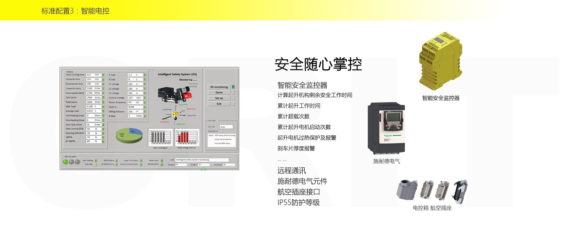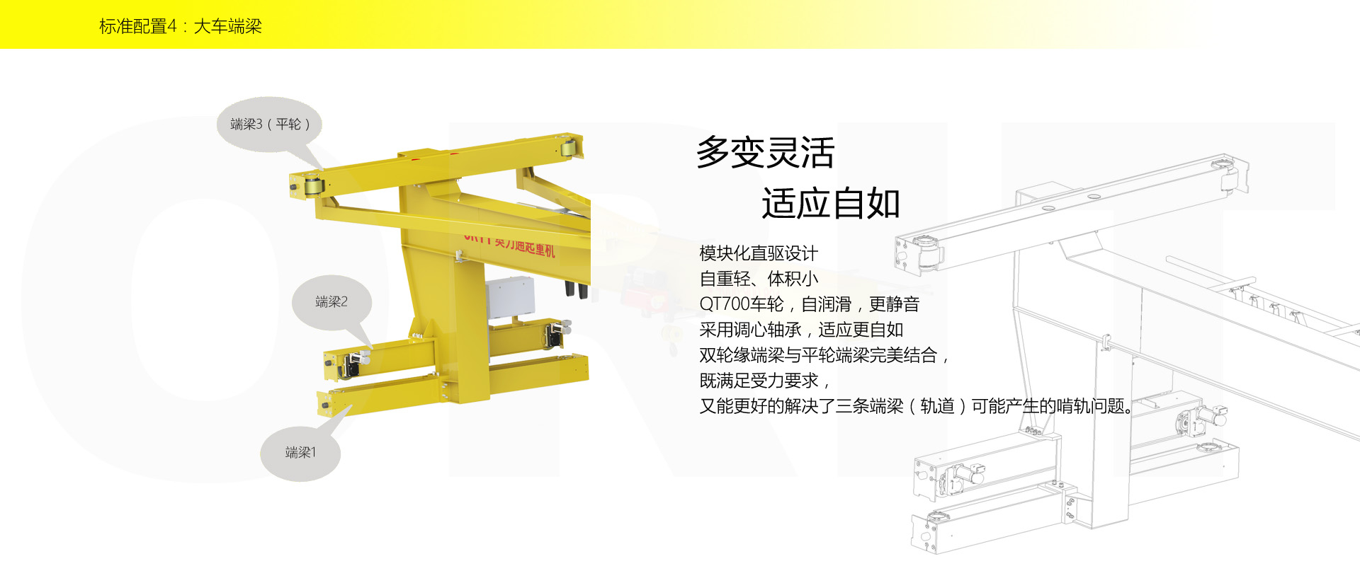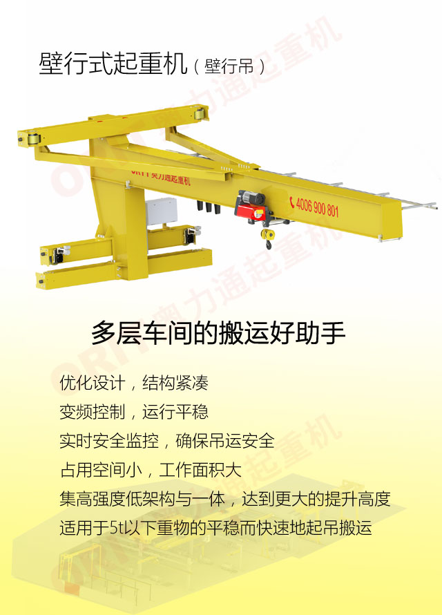 產品名稱:壁行式起重機 多層車間的最佳選擇 優化設計,結構緊湊 變頻控制,運行平穩 實時安全監控,確保吊運安全 占用空間小,工作面積大 集高強度低架構與一體,達到最大的提升設計 適用于5t以下額定載荷平穩、快速地起吊搬運。 標準配置1:起升機構 顛覆傳統,自成一體 低凈空設計 柔性驅動,內應力小,傳動效率高 重級制電機,接電持續率60%ED 行走變頻無極調速,運行平穩 自調試電磁盤式制動器,可靠,防塵 2160N/mm2 高強度鍍鋅鋼絲繩,免維護 全周型導繩器,防松繩 全系標配安全監控系統 標準配置2:三合一驅動 靜音科技,靜享搬運 結構緊湊,鋁合金殼體,密封 變頻電機+硬齒面減速箱+盤式制動器 龍門專用C型三合一集成化設計,節約空間 全變頻調速 最高轉速4800 r/min 防護等級IP55 半油脂潤滑,免維護 靜音科技,靜享搬運 標準配置3:電控系統 安全隨心掌控 智能安全監控器 計算起升機構剩余安全工作時間 累計起升工作時間 累計超載次數 累計起升電機啟動次數 起升電機過熱保護及報警 剎車片厚度報警 ... ... 遠程通訊 施耐德電氣元件 航空插座接口 IP55防護等級 標準配置4:端梁 多變靈活,適應自如 模塊化直驅設計 自重輕、體積小 QT700車輪,自潤滑,更靜音 采用調心軸承,適應更自如 雙輪緣端梁與平輪端梁完美結合, 既滿足受力要求, 又徹底的解決了三條端梁(軌道)可能產生的啃軌問題。 應用